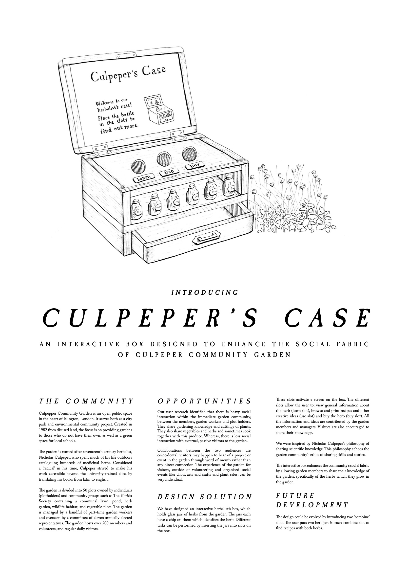 Culpeper’s Case is a physical, herbalist-style cabinet with an integrated touchscreen. It allows visitors to: