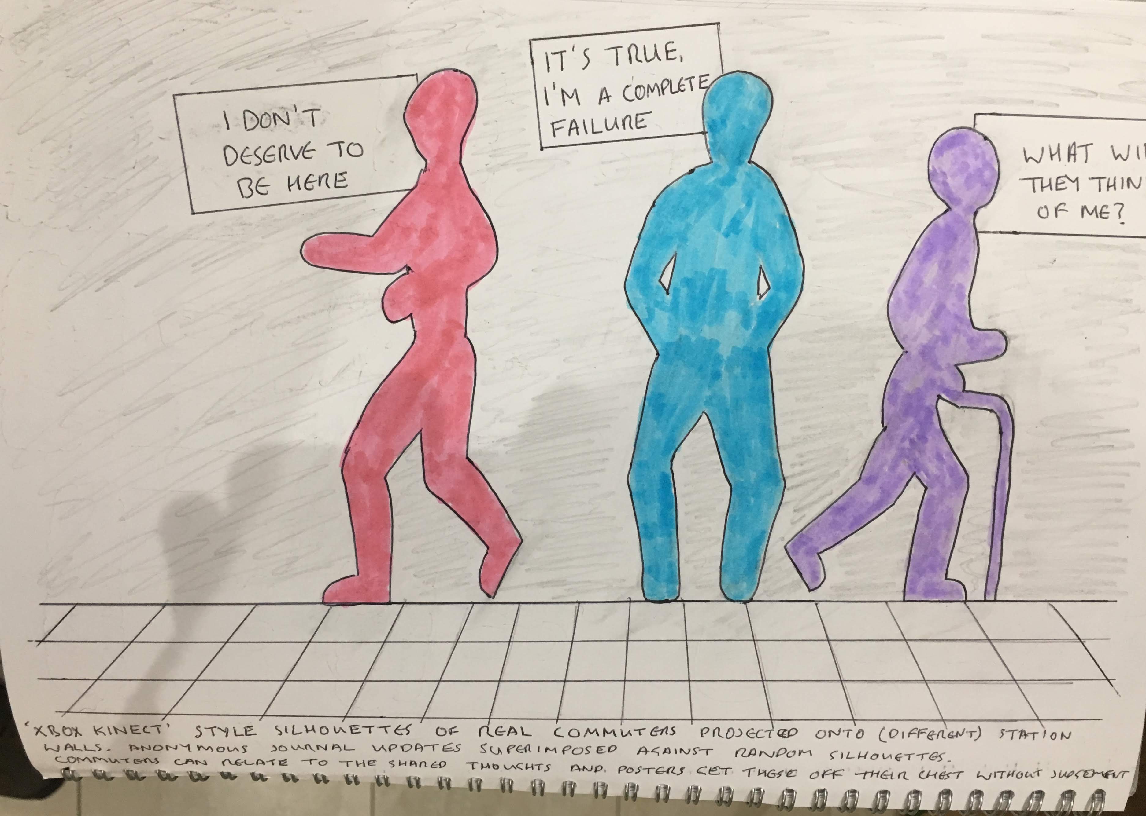 I made several sketches exploring installations that would allow people to report how they were feeling, and have this made visible in some way to their community.