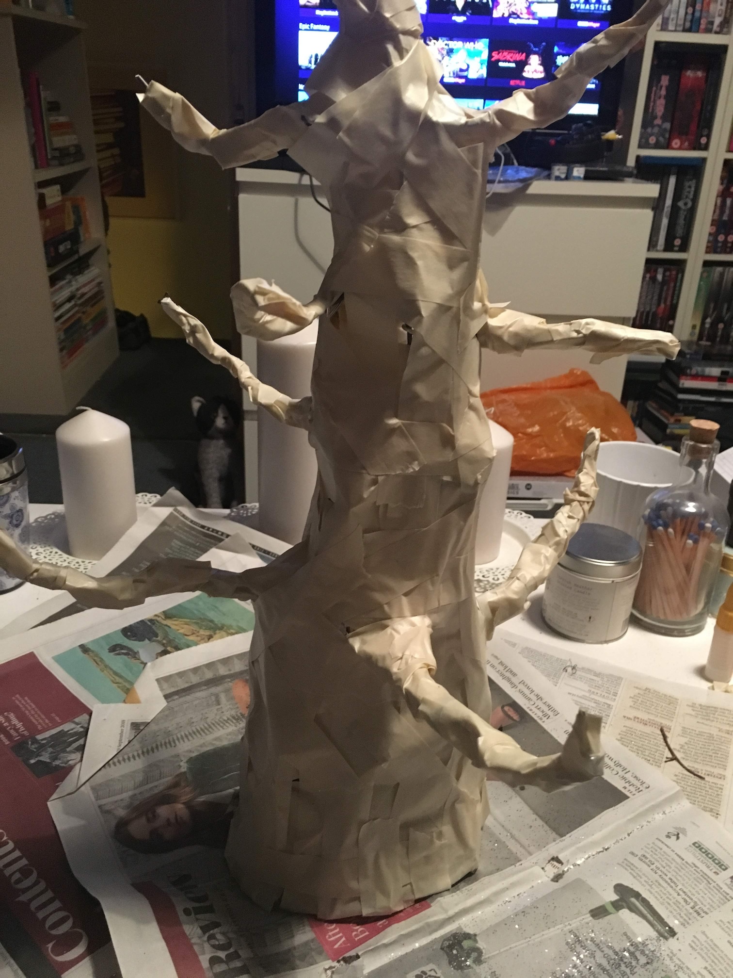 Reshaping branches with aluminium wire building form using masking tape and paper mache