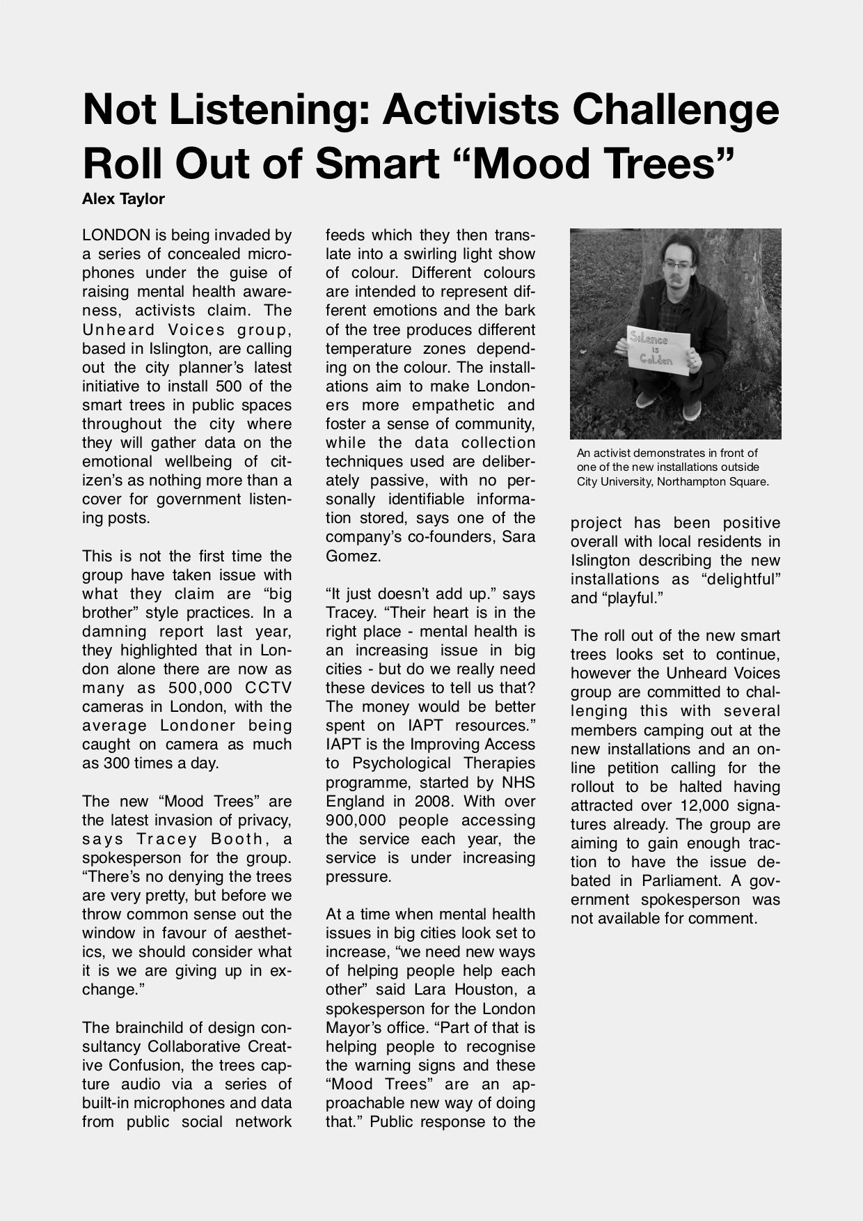 A speculative newspaper article imagining public resistance to the trees